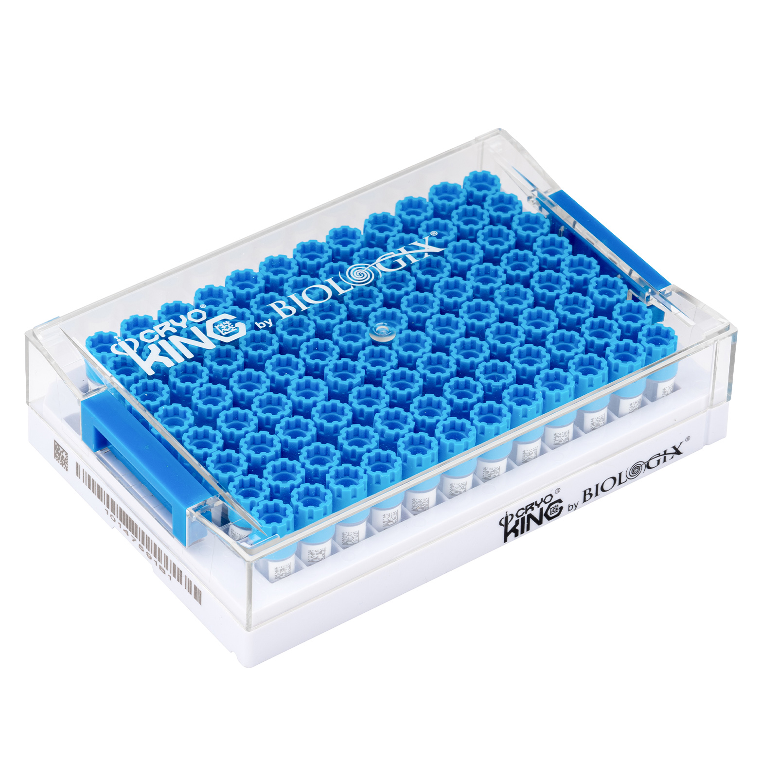 CryoKING SBS 0.4ml Vials Combo, External thread, Sky blue caps. Dimensions(mm): 128*85*32. Sterile. RNase& DNase free, Non-Pryogenic, foreign DNA free, Working temperature : -196 ℃–121 ℃, 96 Vials + 1 Rack/ Set / Bag ,10 Bags/Pack , 2 Packs/Case