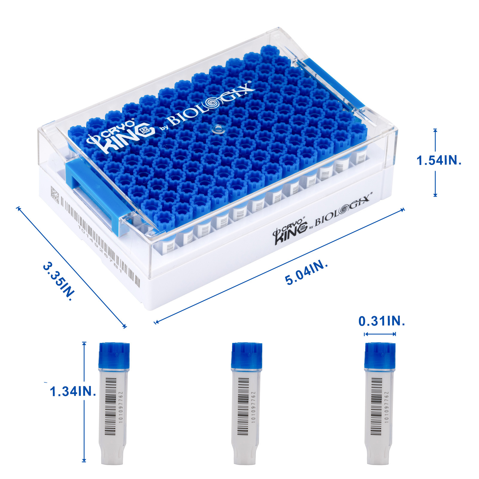 CryoKING SBS 0.75 ml Vials Combo, External thread, Biologix blue caps. Dimensions(mm): 128*85*39. Sterile. RNase& DNase free, Non-Pryogenic, foreign DNA free, Working temperature : -196 ℃–121 ℃, 96 Vials + 1 Rack/ Set / Bag ,10 Bags/Pack , 2 Packs/Case
