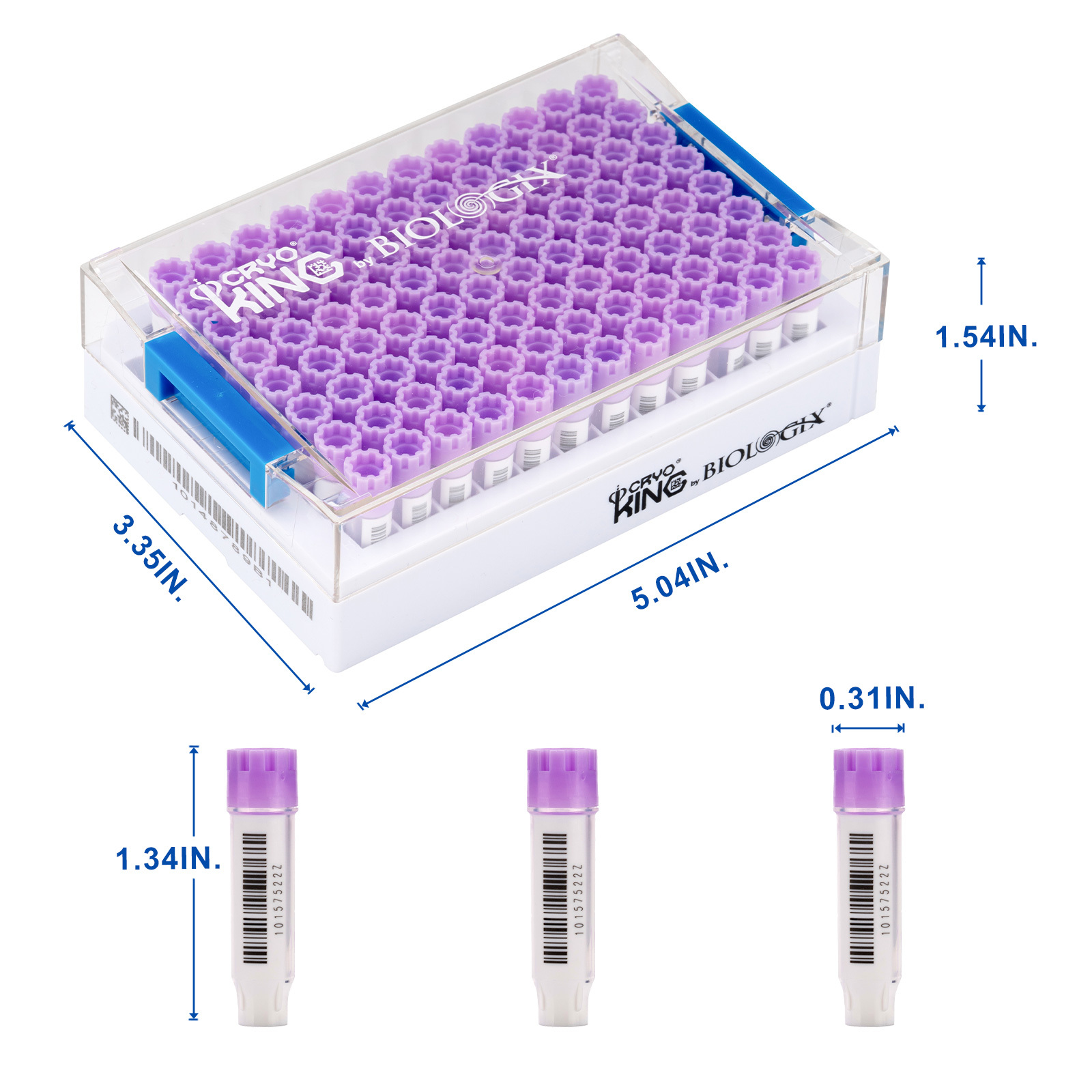 CryoKING SBS 0.75 ml Vials Combo, External thread, Lavender purple caps. Dimensions(mm): 128*85*39. Sterile. RNase& DNase free, Non-Pryogenic, foreign DNA free, Working temperature : -196 ℃–121 ℃, 96 Vials + 1 Rack/ Set / Bag ,10 Bags/Pack , 2 Packs/Case