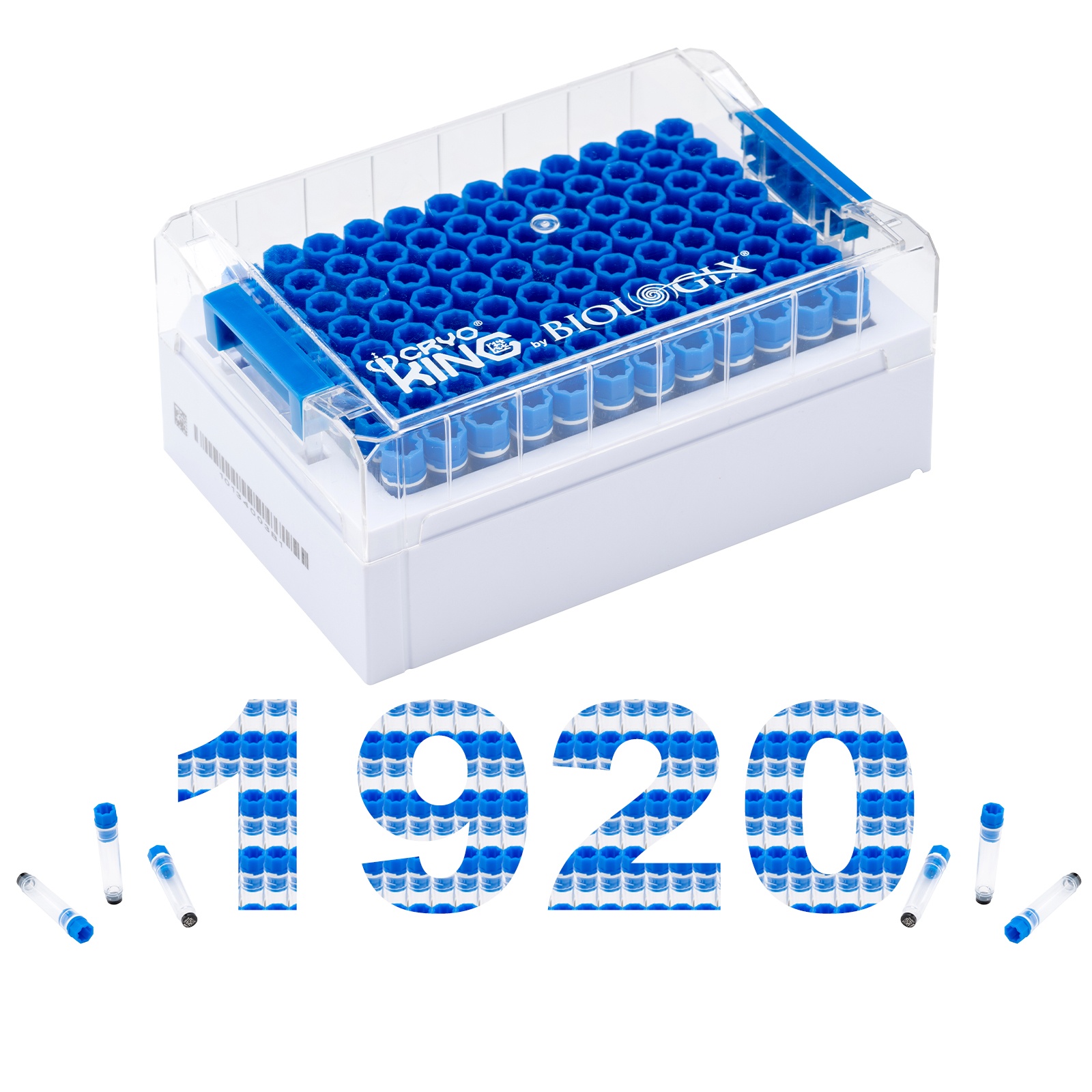 CryoKING SBS 0.75ml Internal vial combo,blue cap, Bottom barcodes on the Vials; Three barcodes on the side of SBS format racks, and 2D barcode at the bottom of racks; SBS format rack (Square Hole) fits 96-well format cryogenic vials perfectly for automatic operations; Working temperature: -196 ℃–121 ℃, Dimensions(mm): 128x85x56,96 vials+1 rack/Sets/Bag ,10 Bags/Pack , 2 Packs/Case