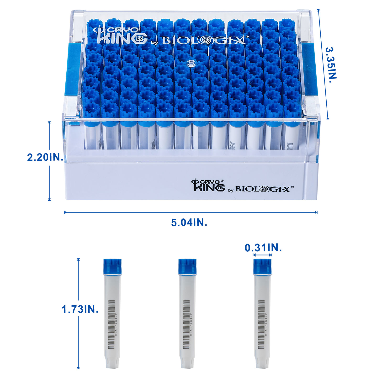 CryoKING SBS 1.4ml Vials Combo, External thread, Biologix blue caps. Dimensions(mm): 128*85*56. Sterile. RNase& DNase free, Non-Pryogenic, foreign DNA free, Working temperature : -196 ℃–121 ℃, 96 Vials + 1 Rack/ Set / Bag ,10 Bags/Pack , 2 Packs/Case