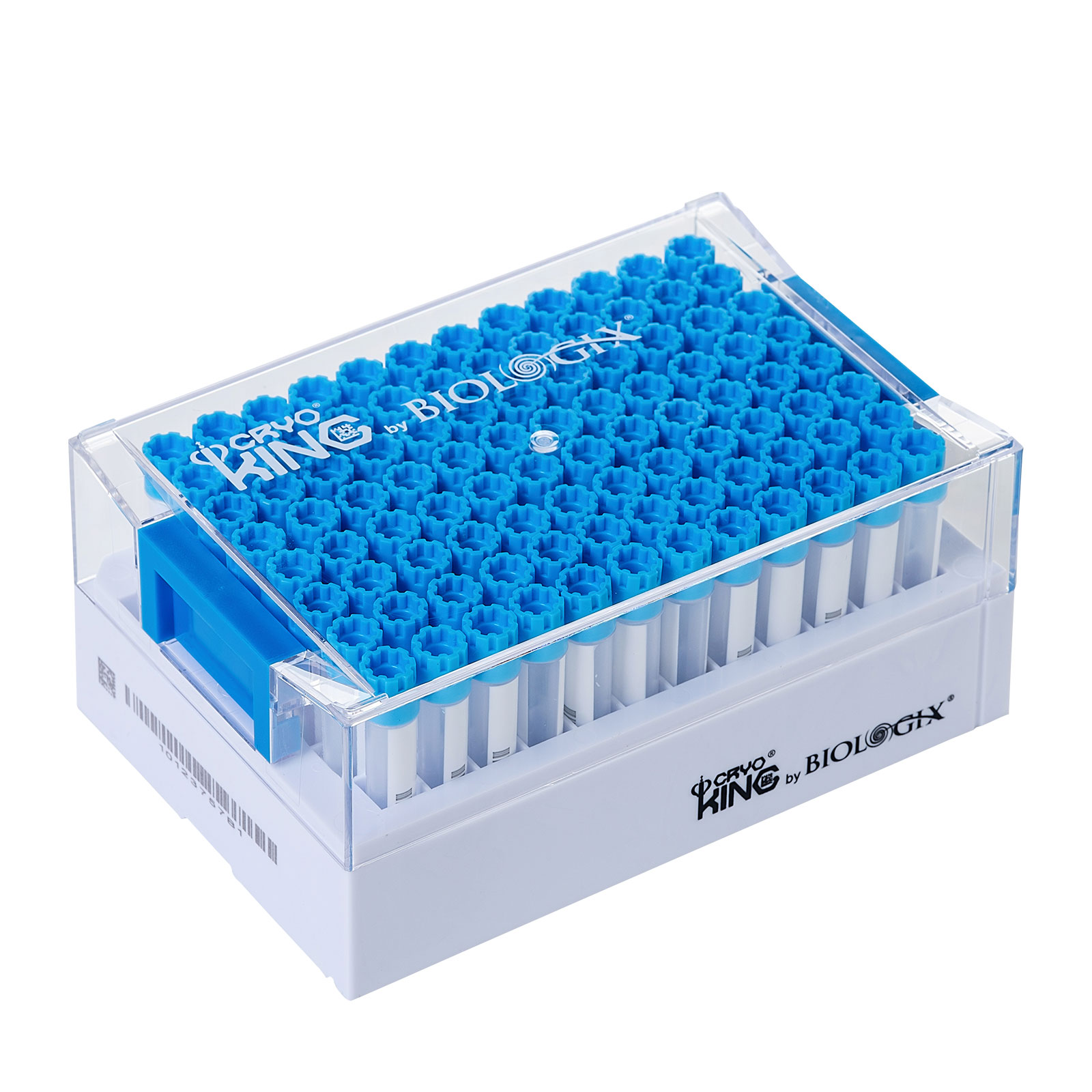 CryoKING SBS 1.4ml Vials Combo, External thread, Sky blue caps. Dimensions(mm): 128*85*56. Sterile. RNase& DNase free, Non-Pryogenic, foreign DNA free, Working temperature : -196 ℃–121 ℃, 96 Vials + 1 Rack/ Set / Bag ,10 Bags/Pack , 2 Packs/Case