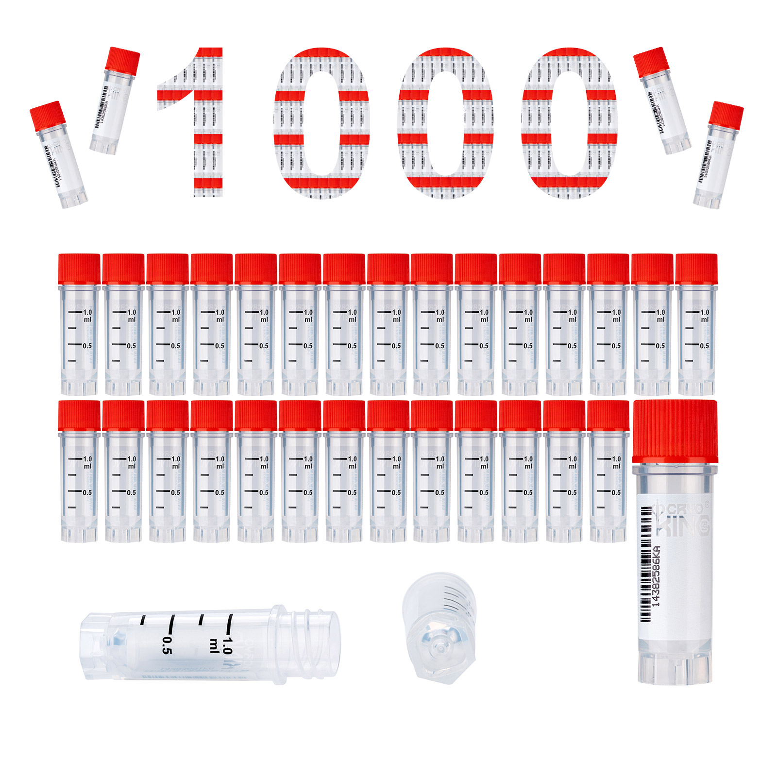 CryoKING 1.0ml vial, red Caps,PP,autoclavable; radiation sterilization, DNase & RNase free, endotoxin free, foreign DNA free, side barcoded , Working Temperature from -196°C to 121°C; Self-standing, No O-ring, 25 Pieces/Bag, 20 Bags/Pack, 2 Packs/Case