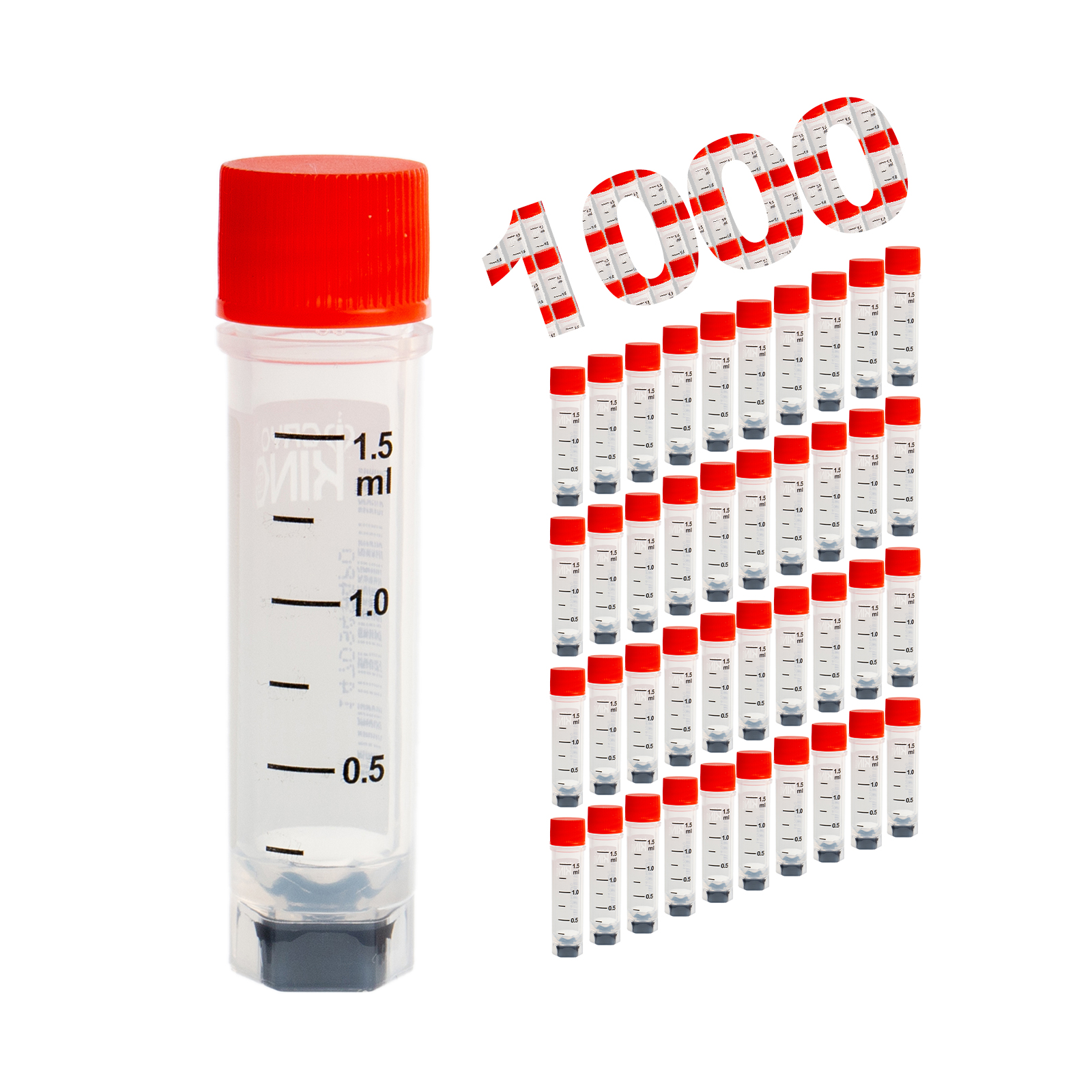 CryoKING 1.5ml cryogenic vials, red caps, PP, 2D Barcoded + side code, self-standing,PP, autoclavable, radiation sterilization, DNase & RNase free, endotoxin free, foreign DNA free, no O-ring, Working Temperature from -196°C to 121°C, 25 Pieces/Bag, 20 Bags/Pack, 2 Packs/Case.