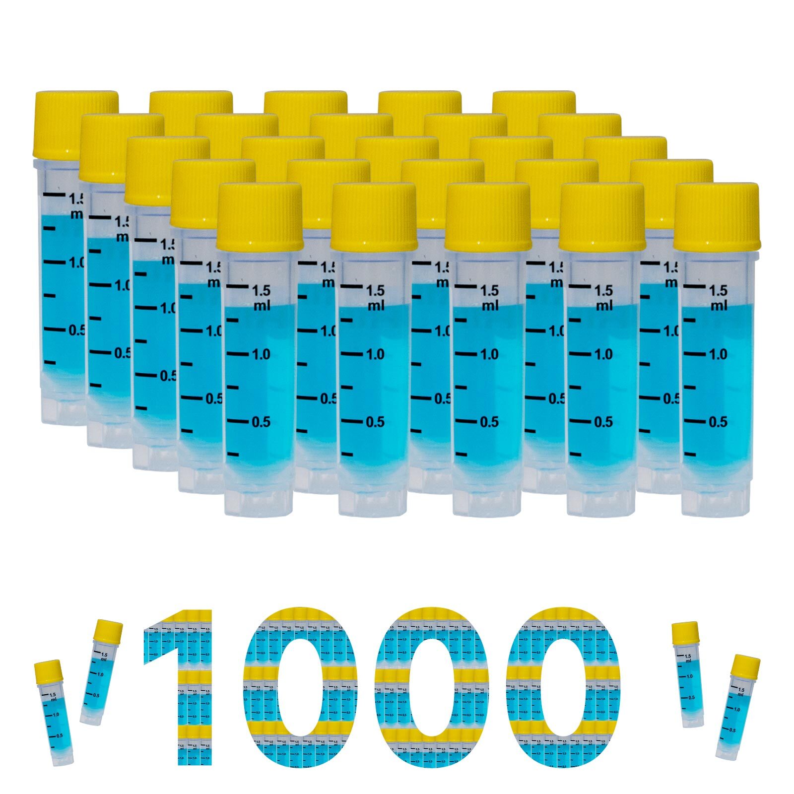 CryoKING 1.5 ml vial, External Thread, Yellow Caps, PP, autoclavable; radiation sterilization, DNase & RNase free, endotoxin free, foreign DNA free, no barcode, no barcode, Working Temperature from -196°C to 121°C; Self-standing, with White Printing. No O-ring, 25 Pieces/Bag, 20 Bags/Pack, 2 Packs/Case