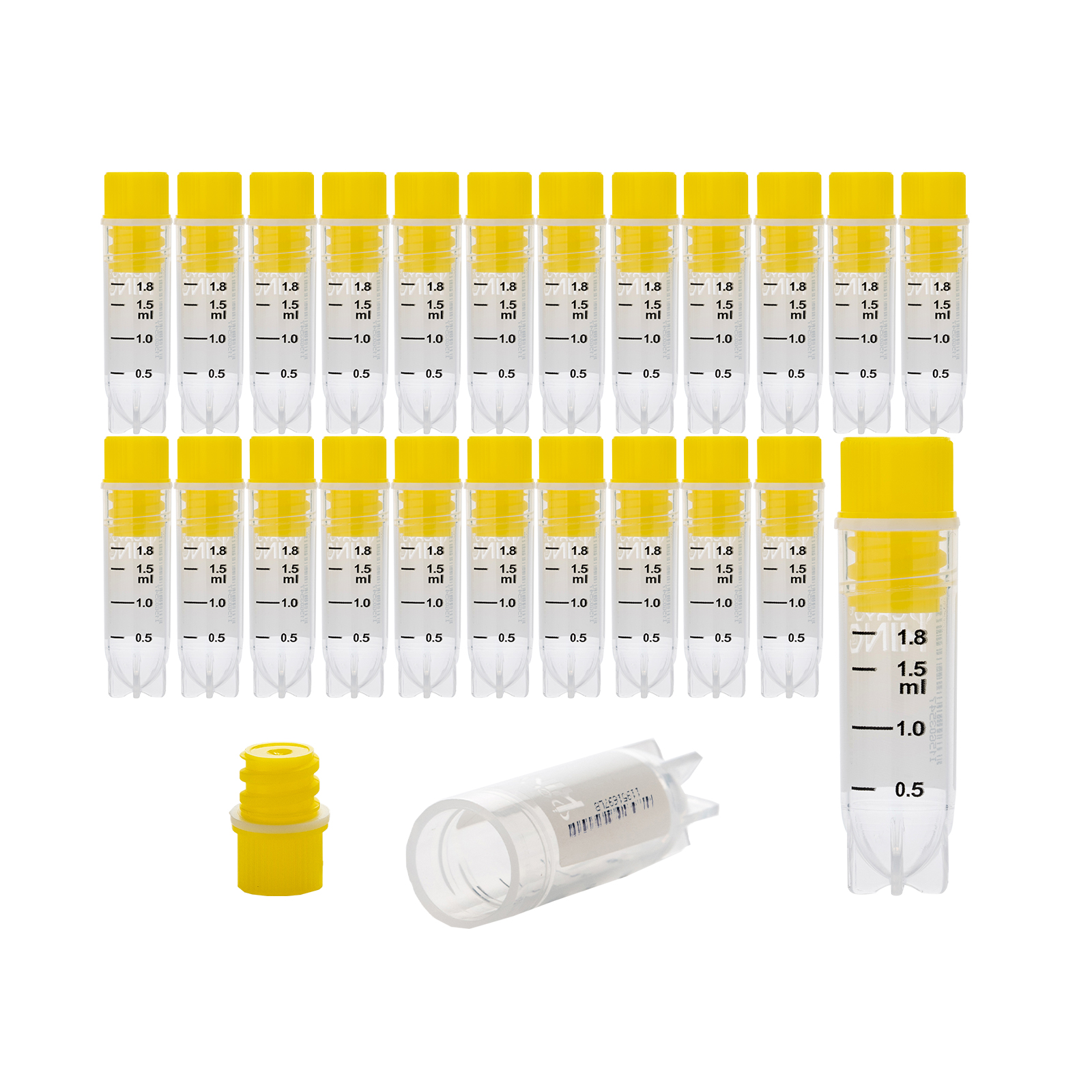 CryoKING 2.0 ml vial, Internal Thread, Yellow Caps,PP,autoclavable; radiation sterilization, DNase & RNase free, endotoxin free, foreign DNA free, side barcode, Working Temperature from -196°C to 121°C; Self-standing, with O-ring, 25 Pieces/Bag, 20 Bags/Pack, 2 Packs/Case