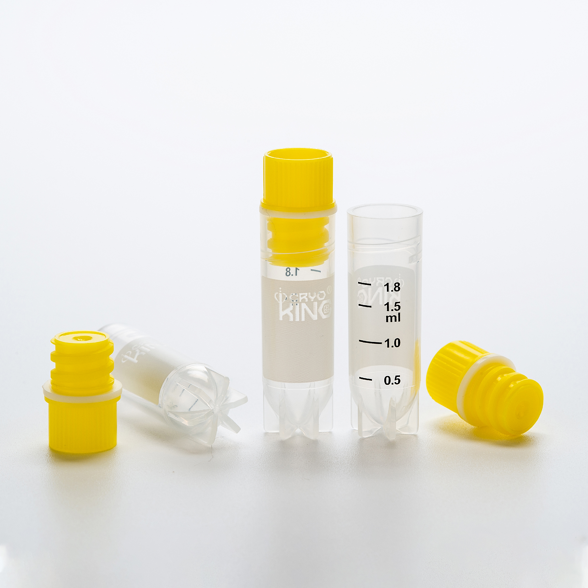 CryoKING 2.0 ml vial, Internal Thread, Yellow Caps, PP, autoclavable; radiation sterilization, DNase & RNase free, endotoxin free, foreign DNA free, no-side barcoded. Working Temperature from -196°C to 121°C; Self-standing, with White Printing. with O-ring, 25 Pieces/Bag, 20 Bags/Pack, 2 Packs/Case