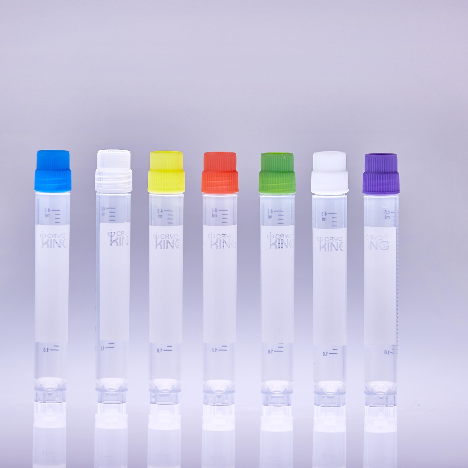CryoKING 5.0 ml vial, External Thread, Purple Caps, PP, autoclavable; radiation sterilization, DNase & RNase free, endotoxin free, foreign DNA free, no barcode, no barcode, Working Temperature from -196°C to 121°C; Self-standing, with White Printing. No O-ring, 25 Pieces/Bag, 20 Bags/Pack, 2 Packs/Case