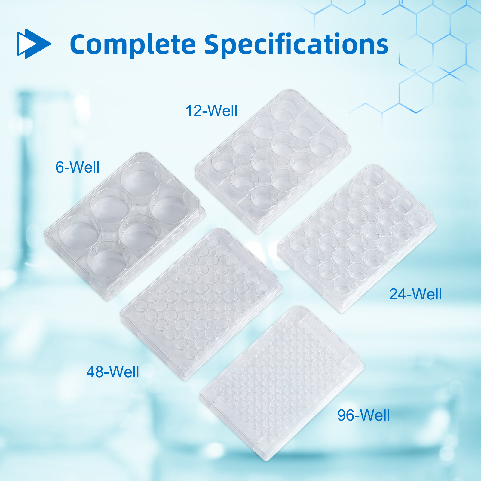 Multi well Culture Plate, PS, 48 wells, 85.4×127.6mm, TC Treated, with lid, flat-bottom, Sterile to SAL 10-6, Imported raw materials, DNase & RNase free, 1/bag, 50bags/case